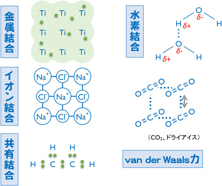 金属では、原子の一番外側(最外殻) の電子は自由に動き回ることができます(自由電子)。電子の海の中に、原子核が浮かんでいるようなイメージです。電子が自由に動き回れるので、電気伝導や熱伝導特性に優れています。原子の結合様式には図に示したようにいろいろなものがあり、それによって様々な物質の特徴を示すようになります。