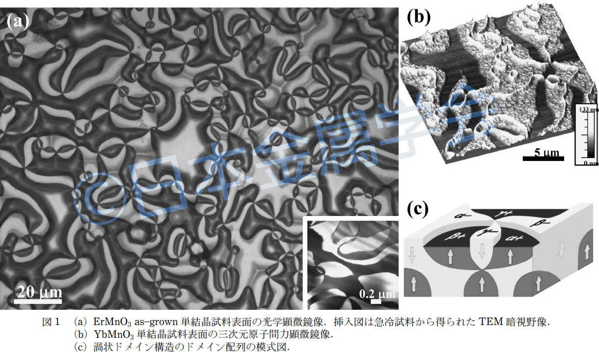 リン酸を用いて表面をエッチング処理した ErMnO3 As-grown 単結晶から得られた光学顕微鏡像を、図1(a)に示す。光学顕微鏡像中には100 μm 以上の広範囲にわたって、大きさが 10~20 μm 程度の 6 つのドメインが 1 点で交わった特徴的なコントラストが観察される。このコントラストは図 1(b)の AFM 像および 1(c)の模式図で示すように、180°強誘電ドメインの分極方向に依存したエッチング速度の差の結果生じたと考えられる(4)。一方、急冷単結晶内部から得られた TEM 超格子反射暗視野像(図 1(a)挿入図)中には、主に 0.2~1 μm 程度の渦状ドメイン構造が明瞭に観察される。両者を組み合わせたマルチスケール観察から、本系における渦状ドメイン構造は、102 以上異なるスケールにおいても同一の構造を有することが明らかとなった。