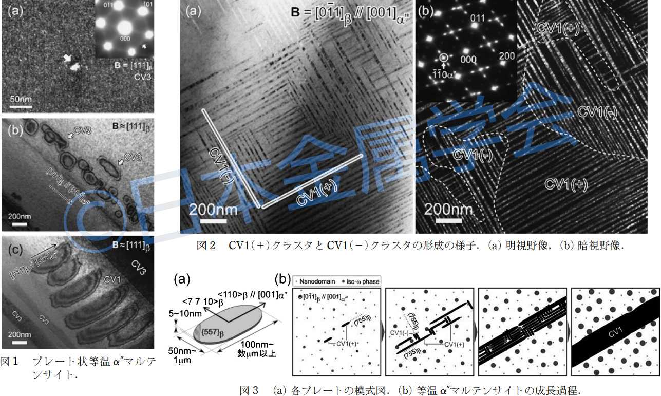 酸素原子により数 nm 程度の martensite-like な変調構造(nanodomain)が β 相中に生成しマルテンサイト変態が抑制されるが(1)(2)、等温保持により数十 nm のマルテンサイトが生成した(図1a)。さらに等温保持を続けることでこのマルテンサイトはプレート状になり(図1 b、c)、同一の格子対応バリアント(CV)となるプレート状マルテンサイト同士は互いに密集して生成・成長することでクラスタを形成した(図2)。各プレートの晶癖面はおおよそ{557}β であり(図3a)、マルテンサイト変態の現象論(PTMC)から計算される値と一致した。プレートの生成と成長により各クラスタ領域が増大すると同時に、プレート間に残された β 相が消失することでより大きなマルテンサイトになると考えられる(図 3b)。