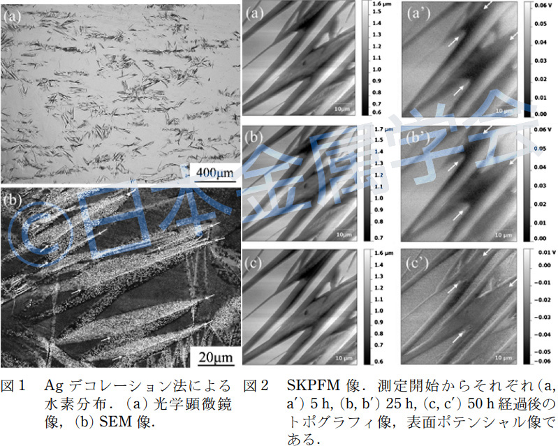 鉄鋼材料において、侵入水素分布の可視化は水素脆化機構解明のため必要不可欠な技術である。水素脱離に関する流速分布は、その拡散能の高さから、Multi-scale かつ Kinetically に微視組織スケールで示す必要がある。この要求される水素の可視化を実現するため、Fe-32Ni-0.2C (wt.%)オーステナイト/マルテンサイト二相組織を対象とし、Ag デコレーション法により Multi-scale での特徴、走査型ケルビンプローブフォース顕微鏡法(SKPFM 法)によりその時間依存性を示した。Agデコレーション法は、77 K 冷却によるマルテンサイト変態由来の表面起伏が形成された試料に対し、9 h 電解水素チャージし、4.3 mM Ag[K(CN)2]水溶液に 3 h 浸漬したのち観察を行った。SKPFM法は、77 K 冷却済み試料を鏡面研磨後、3%ナイタールでエッチングを施した試料に対し、1h 電解水素チャージし、物理蒸着により表面に100 nm Pd 層を形成したのち観察を行った。Ag デコレーション法では広範囲にわたってマルテンサイト部の水素の流速が大きく(図1(a))、2 つのマルテンサイト板の接合界面で流速が特に大きいことが示されている(図 1 ( b )黄矢印部)。この特徴はSKPFM 法による表面電位像でも現れており(図2(a′、 b′)白矢印部)、時間経過とともにマルテンサイト中の水素の流速分布が均質となることも示されている(図 2(c′))。本観察で得た水素の大流速部は、水素助長割れの発生サイトに対応する結果 である(1)