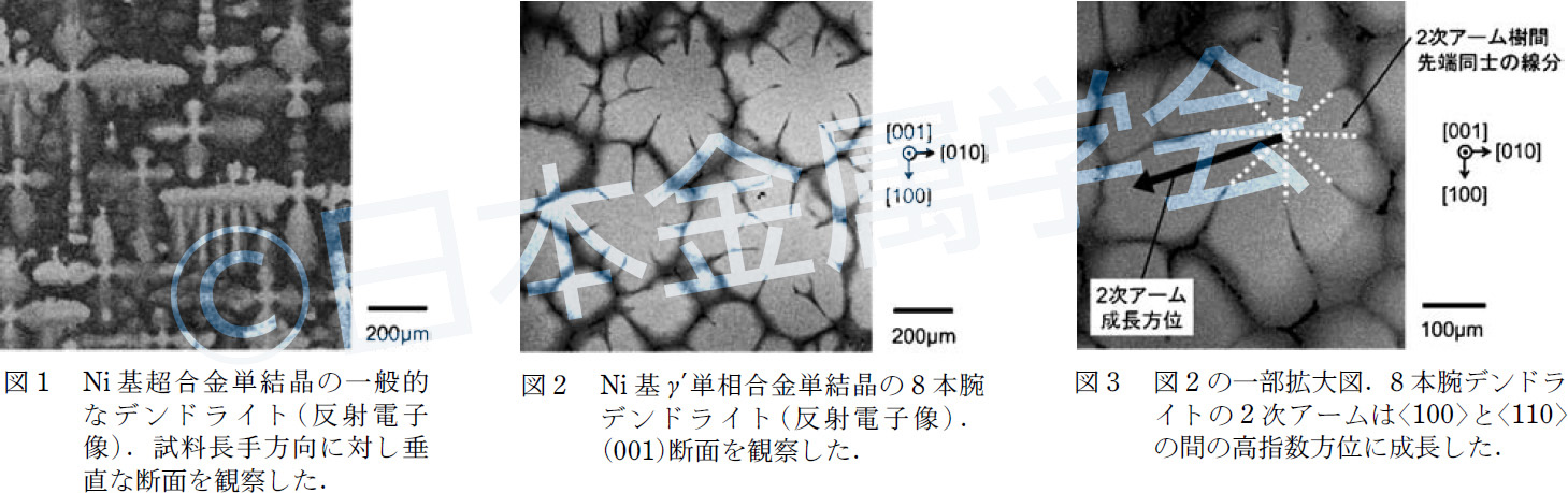 FCC 構造を有する金属および合金の凝固における優先成長方位は通常〈100〉方位である。したがって、Ni 基超合金などのFCC 合金を一方向凝固させると、2 次デンドライトアームが[100]に等価な4 方向に成長する(図1)。一方、著者らはNi 基γ′単相合金において、1 次アームが[001]方位に成長するにも関わらず2 次アームは8 方向に成長する特異な一方向凝固デンドライトを発見した(図2)。また、この8 方向が〈100〉と〈110〉の間の高指数方位であることを明らかにした(図3)。この8 本腕デンドライト成長の主な要因として、初晶がL12 規則相であることが考えられる(1)。一方、1 次アームと2 次アームで成長方位が異なる点は大変興味深く、研究の深化が求められる。