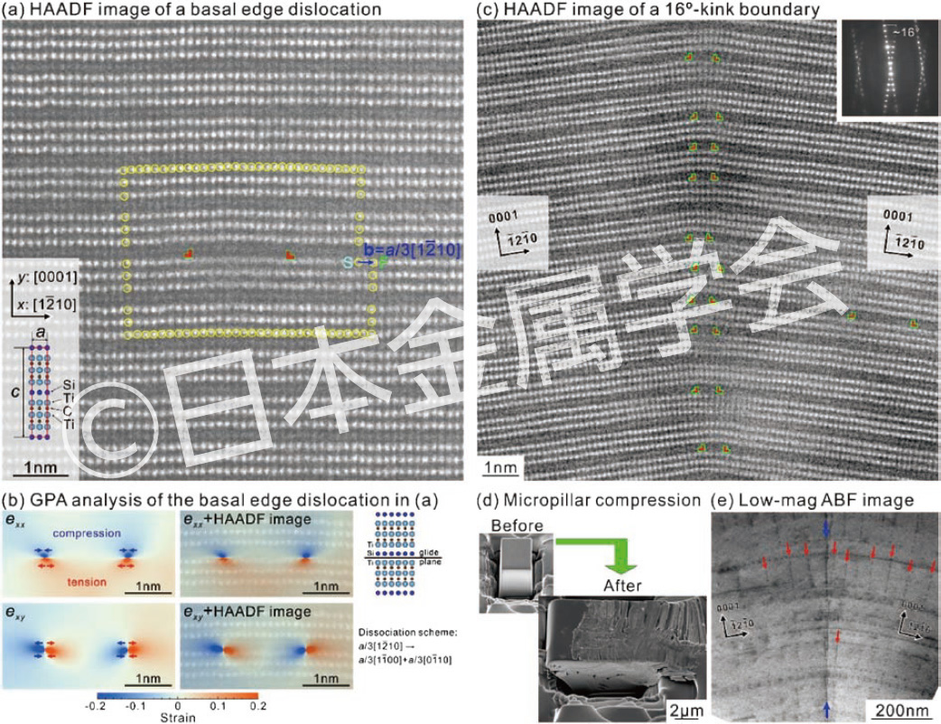 層状化合物MAX 相は高融点、高剛性、高強度、低密度といったセラミックス的性質と、優れた電気・熱伝導性、耐衝撃性、機械加工性といった金属的性質を兼ね備るため新規構造材料として注目されているが、その塑性変形挙動の詳細には未だ不明な点が多い。我々はTi3SiC2 MAX 相において活動する底面a 転位ならびにキンク変形の詳細を高分解能STEM 観察により調査し、底面a 転位がTi 原子層とSi 原子層の間を運動していること、2 本のショックレー型部分転位へと分解していることを明らかにした(図a、b)。またマイクロピラー圧縮試験(図d)により導入されたキンク境界は、底面すべりと同様にTi 原子層とSi 原子層の間に存在する同符号の底面a 転位の配列により形成されていることを確認した(図c、e)。以上からTi3SiC2 MAX 相で見られるキンク組織は底面転位の運動とその刃状転位の配列により形成されるとする古典的キンク形成モデルと矛盾しないことが明らかとなった。