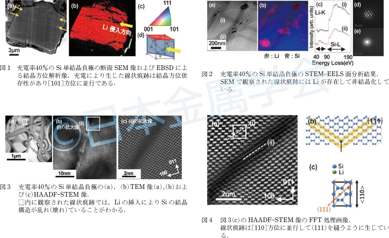 図1に充電率40%のSi 単結晶負極の断面SEM 像とそのEBSD 解析結果を示す。SEM 像よりSi 単結晶には筋状に見える線状痕跡が確認できる。EBSD による方位解析結果から線状痕跡は[101]方位に並行に生じていることが確認できる。図2には同様に断面をSTEM 観察した結果とEELS 法により面分析を行った結果および、線状痕跡(反応相)の電子線回折像を示す。EELS の結果から図1に示す線状痕跡部にはLi が存在し、電子線回折像からSi は非晶質化していることが確認できる。図3は線状痕跡部のTEM およびHAADF-STEM 像を、また図4には図3(c)のHAADF-STEM 像をFFT 処理した画像を示す。これらの結果から、充電にともないSi 単結晶に対してLi イオンがTetrahedral Site に入り込み、ZigZag chain を切るように{111}間のSi 結合を切る事で結晶構造が壊れ、やがてLi 濃度が増加してアモルファス化すると考えられる。