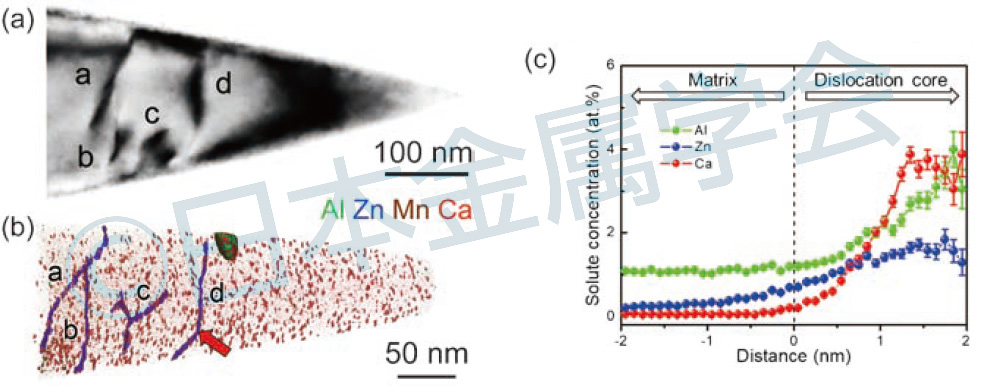 我々は、ひずみ時効処理により大きな強度増加を示すMg-Ca-Al-Zn-Mn 合金を世界に先駆けて開発した。図は、開発合金に2%の引張ひずみを導入した後、170°Cで20分の時効処理を施した試料について、TEM と3DAP による同一視野観察を行った結果である。3DAP 解析前の針状試料をTEM で観察すると、転位が観察される(図(a)中a~d)。この試料に対して3DAP 解析を行ったところ、図(b)、(c)の3D アトムマップと矢印で示した等濃度面の近傍における溶質濃度プロファイルに示すように、転位線上への溶質原子(Al、Zn、Ca)の偏析や、母相中における溶質クラスタを形成が観察できる。