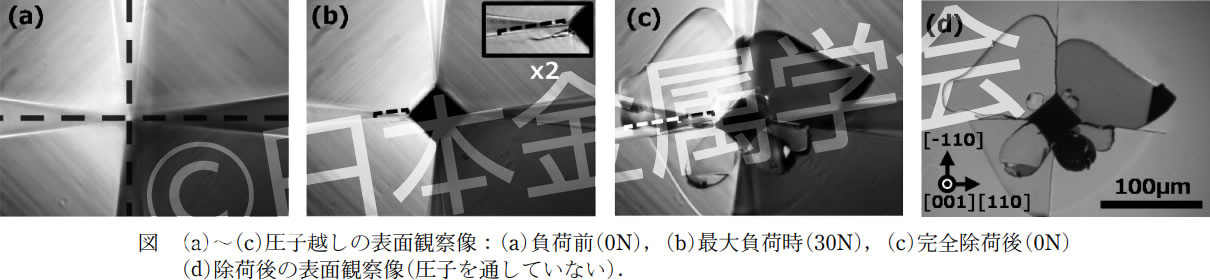 図(a)~(c)に、透明 Vickers 圧子を通して観察した試料表面を示す。(a)は負荷前(0N)、(b)は最大負荷時(30N)、(c)は完全除荷後(0N)を表している。また、図(d)は試験終了後の表面を、圧子を通さずに観察した結果である。(a)内の十字状の点線は実際の圧子稜線部位置である。また、図(b)、(c)中にはそれぞれ、負荷中に進展した亀裂と除荷中に進展した亀裂の近傍に黒点線、白点線を配した。In-situ Vickers インデンテーションにより、負荷過程に比べて除荷過程で大規模な亀裂の進展や破壊が観察された。