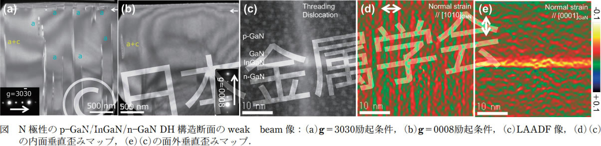 窒化物半導体の結晶成長はその極性の影響を強く受ける。N 極性表面上では In が取り込まれやすい性質を利用した高 In 組成 InGaN 層の成長によるオール窒化物の LED の実現や、車載パワートランジスタにおける逆 HEMT 構造など、Ga 極性よりも優れた機能が期待される。N 極性 GaN の成長表面は荒れやすく実用化への課題の一つであったが、表面窒化した微傾斜サファイア(0001)基板上を利用して、従来作製が困難であった平滑な成長表面を持つ N 極性 GaN の成長が可能になった(1)。我々は、N 極性 GaN/InGaN/GaN ダブルへテロ(DH)構造における貫通転位の性格が Ga 極性の場合と大きく異なることを見出すとともに、InGaN 層との弾性相互作用の視覚化を試みた。図(a)(b)に GaN の g10-10/3g10-10、g0002/4g0002 励起の weak beam 像を示す。g・b 解析より、観察された貫通転位は a 転位(b=a/3[11-20])が支配的であった。基板の表面窒化と薄い低温バッファ層により、面外方向の結晶方位の乱れが少なく、結晶成長核の合体の際に面内回転による歪み緩和と刃状転位の導入が起こったものと考えられる。次に、InGaN 量子井戸構造と貫通転位との弾性相互作用について解析した結果を図(c)-(e)に示す。n-GaN 層から p-GaN 層へ向かって InGaN を貫通している(c)LAADF-STEM 像と同一視野の(d)面内、および(e)面外方向の垂直歪みマップを示す。InGaN は GaN より格子定数が大きく、n-GaN に対して面内方向に整合、面外方向に伸張していることから、InGaN 層は面内圧縮状態にある。さらに、膜厚方向に歪み量の分布が見られる。貫通転位は、InGaN 層の圧縮応力場により余剰原子面側に転位が上昇運動を起こし、p-GaN 層では相対的に逆向きに上昇運動することで貫通転位の湾曲を説明できる(2)。さらに、貫通転位近傍では InGaN 層が 1 nm 厚いことから転位芯の弾性場による In の引き込み効果を示唆している。