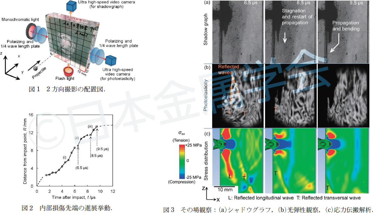 脆性透明材料である石英ガラスにおいて、直径 1 mm、速度2.0 km/s の鋼球の超高速衝突により発生した内部亀裂が、弾性応力波の通過により断続的に進展する様子を、シャドウグラフと光弾性の超高速ビデオカメラ 2 台により直接観察した(図1)(1)。特に図2の進展挙動の後半の(ii)(iii)段階では、モード変換を伴う裏面での反射により縦波と横波の二つに分離した応力波が段階的に損傷先端へ到達し、損傷進展が一旦停滞した後に再度急速に進展するという損傷進展プロセスが明瞭に観察された(図3)。