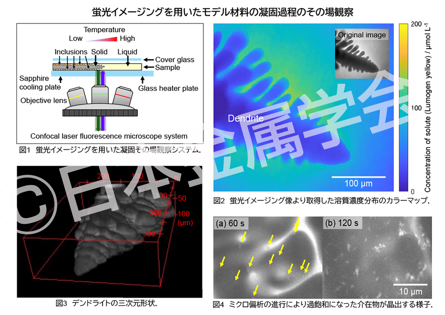 生物分野で活用される蛍光イメージング法を世界に先駆けて凝固研究に導入し、ミクロ偏析をその場観察により定量評価する手法を確立した。さらに、モデル材料を用いた凝固過程において、デンドライトの三次元形状の取得や、介在物晶出過程のその場観察にも成功した。凝固後の製品の良し悪しを大きく左右する偏析や介在物の制御に向け、凝固プロセスを基礎から理解することに繋がることから、高い学術的価値を有する。