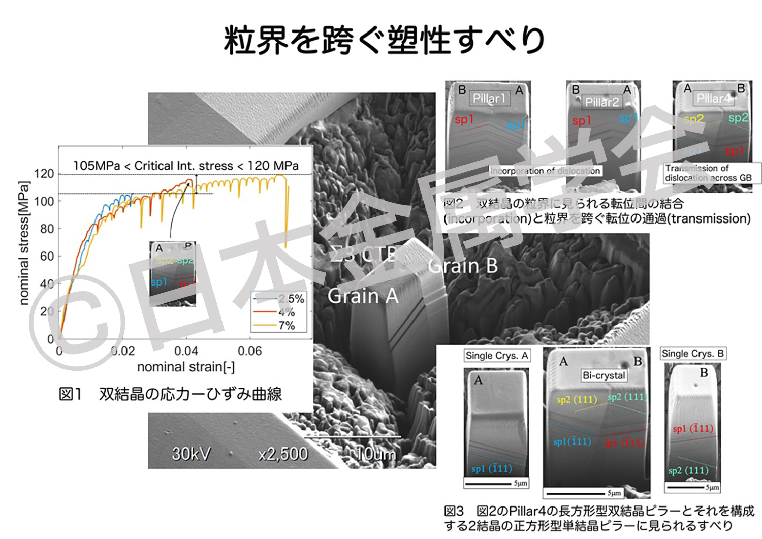 本研究は、2013年度第64回金属組織写真賞走査電子顕微鏡部門奨励賞で受賞した円形断面のマイクロピラー試験片を用いた双結晶マイクロピラーの写真作品から始まった。マイクロピラーを用いた一連のメゾスコーピックな試験方法を確立し、粒界を跨ぐ塑性すべり挙動の観察への挑戦で得られた成果である。10年以上の試行錯誤の末、長方形型マイクロピラー試験片を用いた観察とその力学的評価を得たことに価値を持つ。