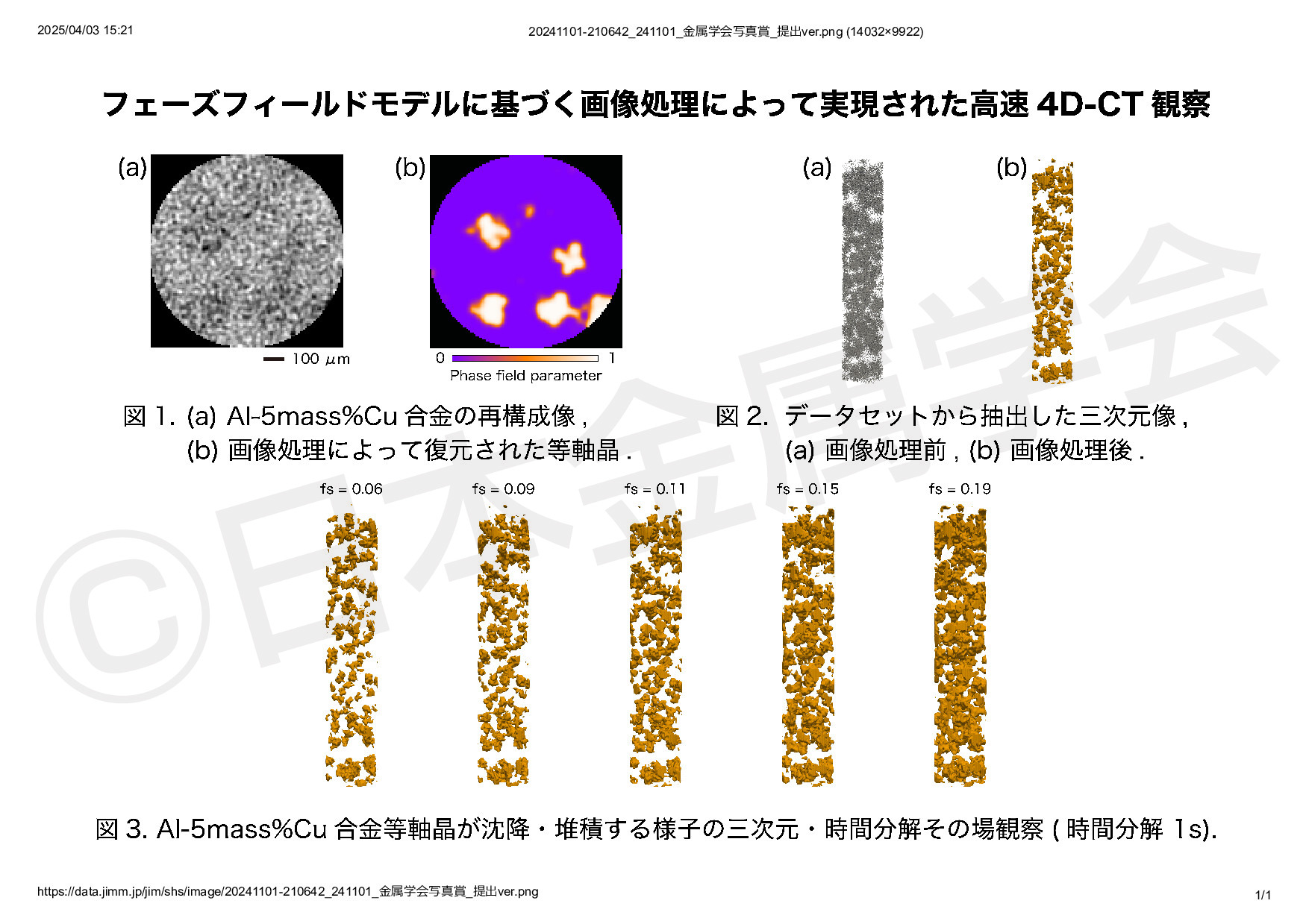 4D-CTの原理的に不可避である時間分解能の追求に伴う再構成像の劣化を、凝固・結晶成長シミュレーションで利用されるフェーズフィールドモデルに基づいた画像処理を施して復元した点に新規性がある。また、高温の金属凝固プロセスの高速4D-CT撮影が可能な独自の実験プラットフォームによって本研究を実現している。今後、更なる高速化が実現できれば、金属3Dプリンタ(AM)の凝固その場観察の実現も期待される。