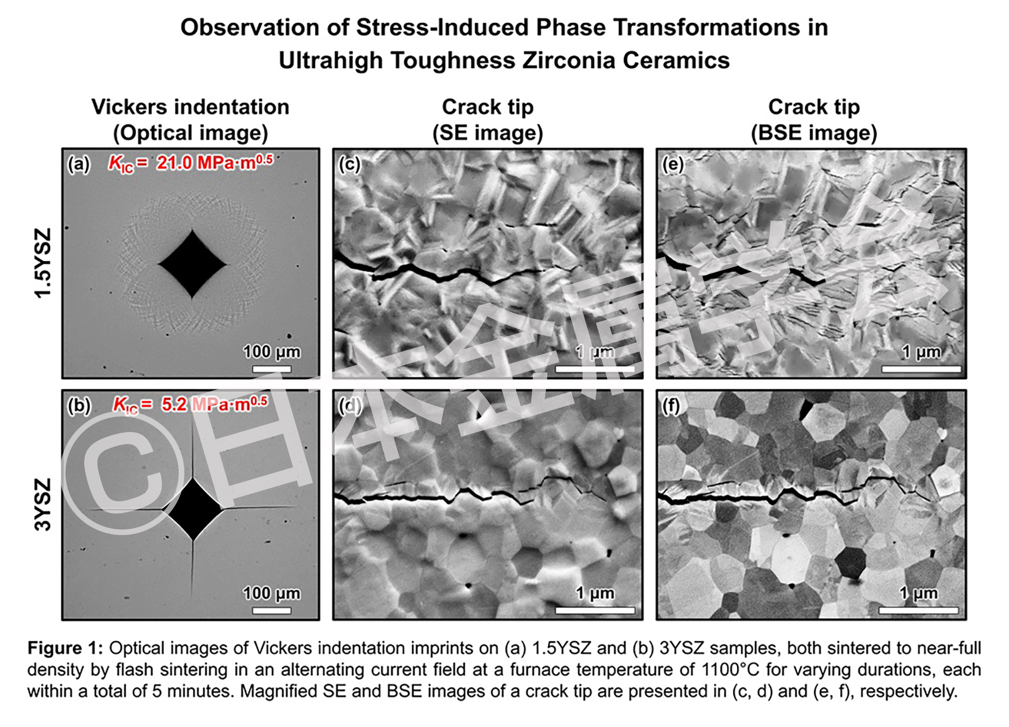 Recent advancements have shown that conventionally sintered 1.5 mol% yttria-stabilized zirconia (1.5YSZ), developed by Tosoh Corporation and the University of Tokyo, exhibits remarkable toughness—approximately four times greater than commonly used 3YSZ materials, as measured by the indentation fracture method. With the global push toward decarbonization, there is an urgent need for low-temperature, short-time sintering methods. Flash sintering presents a promising alternative, utilizing an electric field and current during the sintering process. Intense Joule heating is triggered by a specific combination of electric field strength and temperature, resulting in the instantaneous densification of powder compacts within seconds at significantly lower processing temperatures.