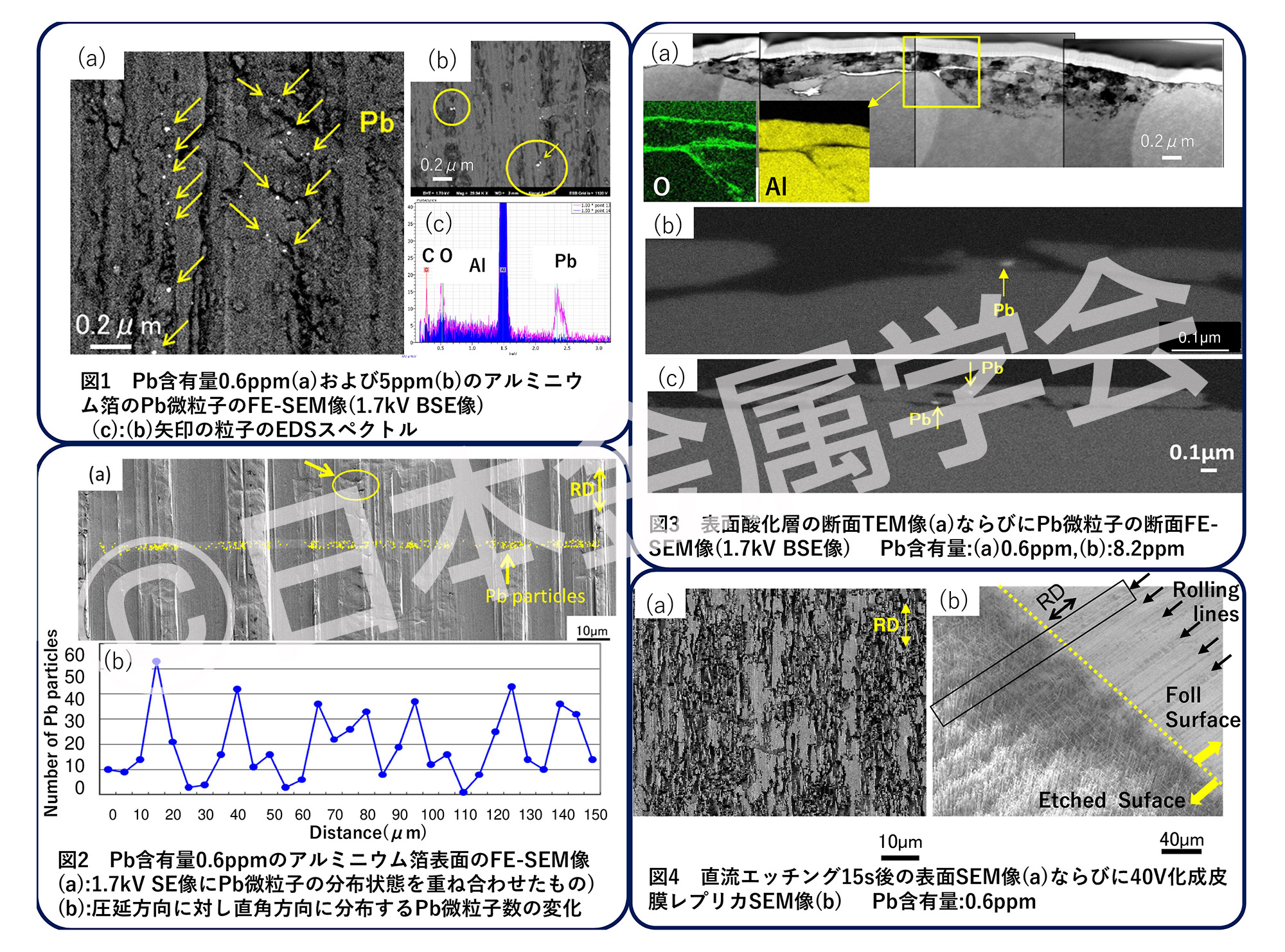 電解コンデンサ用高純度アルミニウム箔にppmオーダーで含まれるPbは立方体方位集積度を高めるための最終焼鈍工程で表面濃化する。Pb偏析サイトとピット形成の関係を明確にするため、低加速・高分解能FE-SEMとTEMを駆使し、微粒子で存在するPbの分布状態を広範囲で観察した。Pb微粒子はFE-SEMの1.7kV BSE像(反射電子像)を用い、AlとPbの原子番号の差によるコントラストで観察可能である(図1)。試料はPb含有量0.6ppmならびに5ppmの高純度アルミニウム軟質箔(厚み110μm)である。PbはBSE像で微粒子として圧延方向の隆起部に沿って多く分布する(図1(a)矢印)。Pb5ppmの箔の微粒子(図1(b)矢印)を加速電圧5kVでEDS分析するとPbが検出される。Pb 0.6ppmの箔表面の0.66kV SEM像を図2(a)に示す。表面は帯状の隆起部と平滑部が混在し、隆起部の一部(楕円枠)には亀裂が圧延方向に対して直角方向に生じている。30000倍のBSE像でPb微粒子を圧延方向に対し直角方向に連続して撮影し、得られた画像を図2(a)に重ね合わせた。Pb微粒子は隆起部と平滑部から成る表面形態に対応し、約30μmの周期で増減を繰り返す(図2(b))。FIB加工で得られたPb0.6ppmの箔の断面試料をTEM観察すると、図3(a)に示すようにアルミ素地とは異なる不均一な表面層(以下、表面酸化層)が観察され、EDS面分析で層状に酸素が検出される。Pb8.2ppmの箔の隆起部断面を圧延方向に対し直角方向にイオンミリング装置で加工すると、Pb微粒子が表面酸化層の亀裂近傍(図3(b))、層内の空隙ならびにアルミ素地と表面酸化層の界面(図3(c))に分布する様子がBSE像でとらえられる。Pb 0.6ppmの箔を用い、80℃、1mol/dm3塩酸-3mol/dm3硫酸の電解液中にて電流密度250mA/cm2の直流で15s間エッチングすると、図4(a)に示すように隆起部で溶解が進行し、平滑部の一部では溶解が遅延する。化成皮膜レプリカをSEM観察すると隆起部よりも平滑部のトンネルピット長さが短いことが分かる(図4(b))。このことはPb微粒子が多く存在する部分でアルミニウムの溶解が促進され、優先的にトンネルピットが成長することを示唆する。