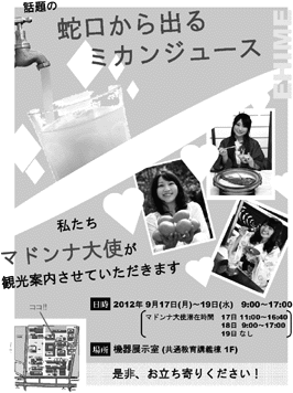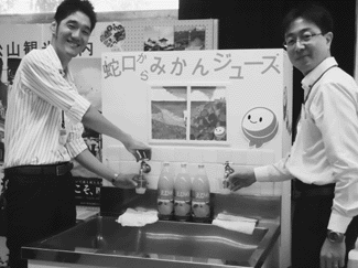 ![]() | ![]() 「蛇口からみかんジュース」製作者および実行委員の 岡野 聡先生(左)と小林千悟先生(右)。 |